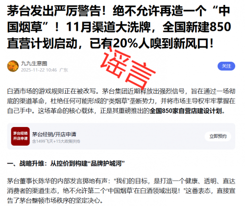 近日,社交平台出现多篇关于“茅台拟在全国新增850家直营店”的网文,声称启动资金降至50万元、每月配套数十箱飞天茅台配额等,引发广泛关注... -