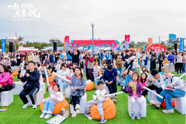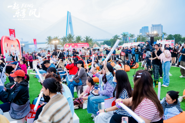 夜幕降临时,缀满现场的品牌定制荧光棒与手环亮起,将 “海南音乐会” 的氛围推向高潮 —— 乐队的 live 演出点燃全场,台下观众举着荧光棒随节奏摇摆。