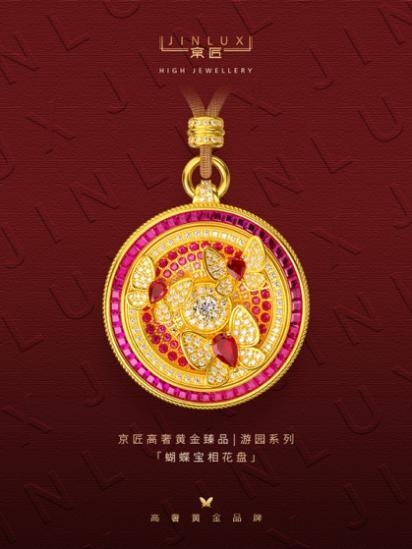 作为京匠最畅销的高奢臻品,「蝴蝶宝相花转盘」「丝光蝶影项链」「无相佛平安扣」等均以黄金为基础,搭配不同形态的红宝石传递自信奢华底蕴,吸引高端消费群体关注。无论是围镶T方切割红宝石的蝴蝶宝相花转盘、鸽血红镶嵌的丝光蝶影蝴蝶项链,还是红宝石异形切割的无相佛平安扣,红宝石的热烈与黄金的贵气融合呼应,即是京匠“金红美学”的体现,也为高奢消费提供新的审美选择。